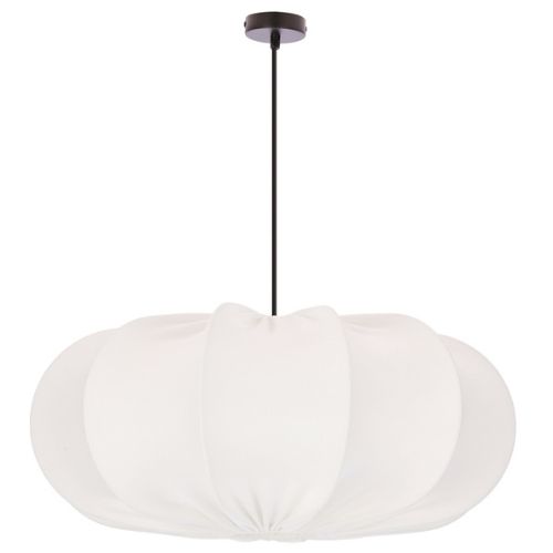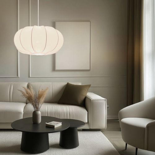 Abażur lampy ma miękki, opływowy kształt przypominający zwiewny kwiat lub delikatnie marszczoną tkaninę. Wykonany z wysokiej jakości materiału w odcieniu ciepłego kremu (latte), pięknie rozprasza światło, tworząc we wnętrzu spokojną, relaksującą atmosferę. Lampa doskonale prezentuje się nad stołem w jadalni, w sypialni nad łóżkiem lub w salonie – jako elegancki akcent dekoracyjny.