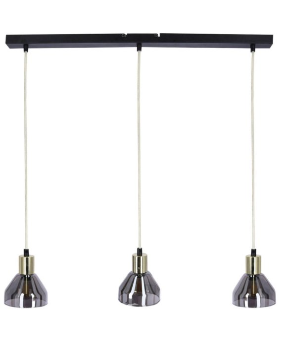 Lampa ma metalową, czarną i podłużną podstawę oraz szklane odymione klosze, co podkreśla loftowy styl.