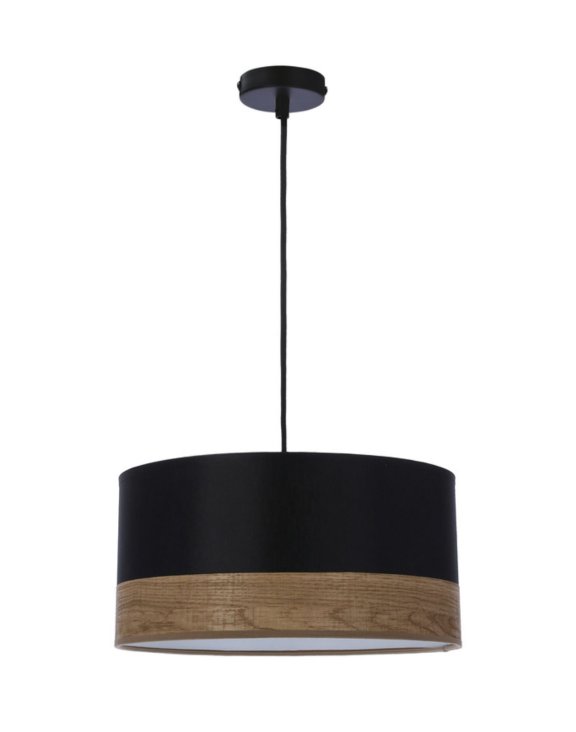 Model posiada metalowe zawiesie w kolorze czarnym, a abażur wykonany jest z tkaniny w tym samym kolorze oraz forniru.