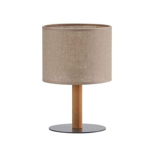 Drewniany stelaż lampy i metalowa czarna podstawa podkreślają elegancję całości.