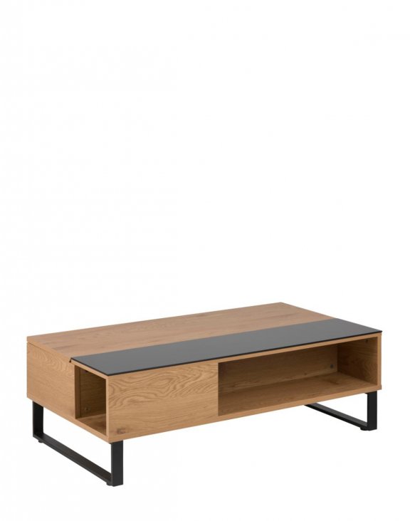 Blat wykonano z drewna w kolorze dębowym i połączono go z elementem z czarnego szkła.