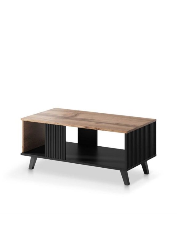 Stolik składa się z dwóch blatów: dolnej półki w wybarwieniu czarnym oraz blatu stolika w okleinie dębowej.