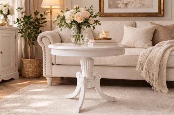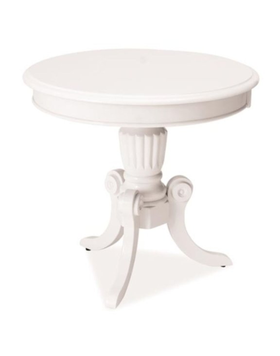 Okrągły blat i dekoracyjne, drewniane nogi nadają meblowi ponadczasowy charakter, dzięki czemu świetnie sprawdzi się w salonach urządzonych w stylu klasycznym, vintage lub retro.