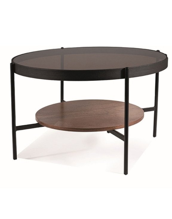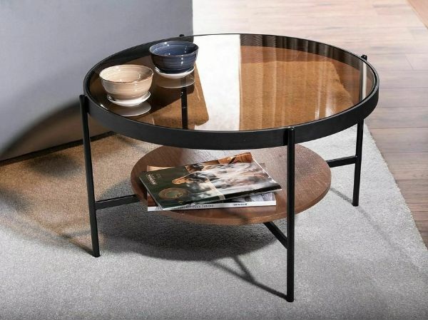 Okrągły blat z dymionego szkła w odcieniu bursztynowym nadaje meblowi elegancji i lekkości wizualnej, dzięki czemu świetnie prezentuje się zarówno w nowoczesnych, jak i loftowych wnętrzach.