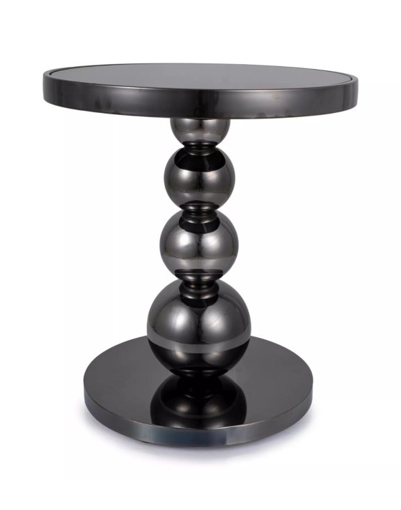 Jej czarny, hartowany blat ze szkła połysk kontrastuje z metalową, stabilną podstawą w tym samym odcieniu, tworząc elegancką całość do salonu, pokoju dziennego lub przestrzeni wypoczynkowej.