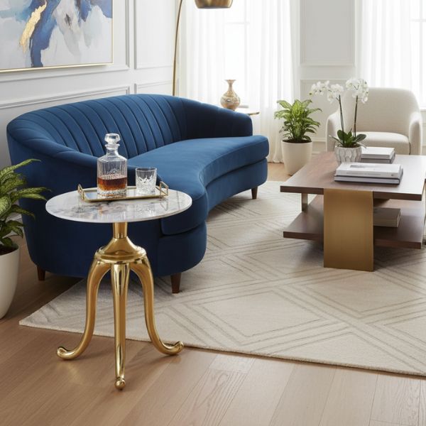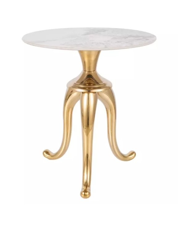 Ława Snake to elegancki stolik boczny / ława, który wyróżnia się okrągłym blatem o efekcie marmuru i metalową podstawą z intensywnym wykończeniem w złotym kolorze — idealna do wnętrz w stylu glamour, nowoczesnym lub luksusowym.