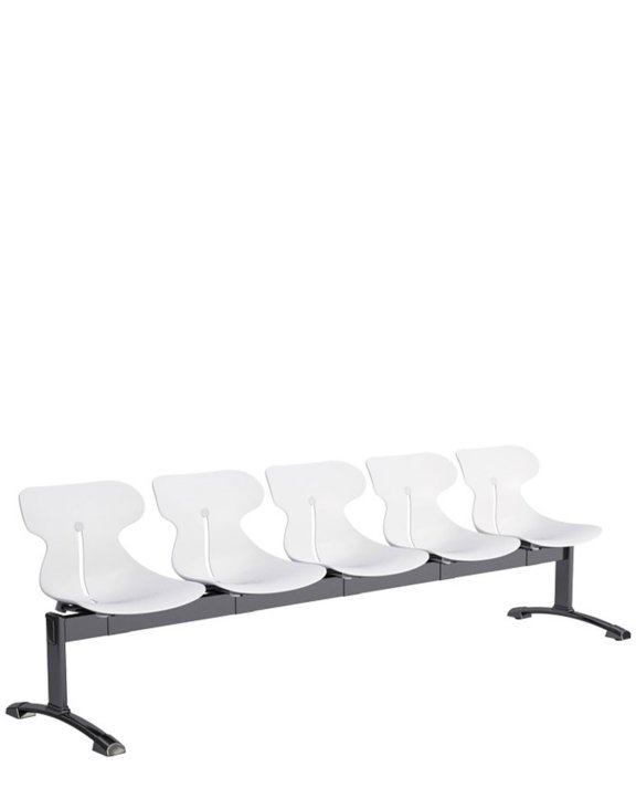 Ławka pięcioosobowa na stalowej konstrukcji z wyraźnie profilowanymi siedziskiem, wyróżniającej stylistyce.