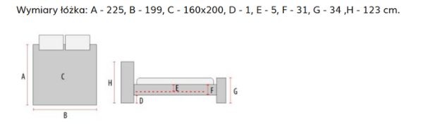 Wymiary łóżka to 225 × 199 cm — odpowiednie dla materaca 160 × 200 cm.