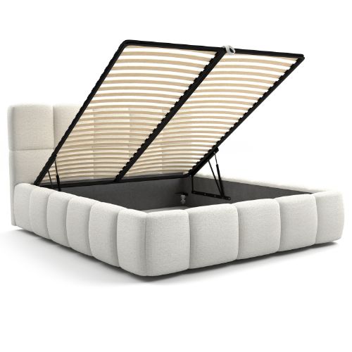 Pod stelażem kryje się pojemny schowek, idealny na przechowywanie pościeli, koców czy sezonowych ubrań. Dzięki mechanizmowi unoszenia materaca z pomocą podnośników gazowych, dostęp do przestrzeni pod łóżkiem jest lekki i wygodny, co znacząco zwiększa jego praktyczność.