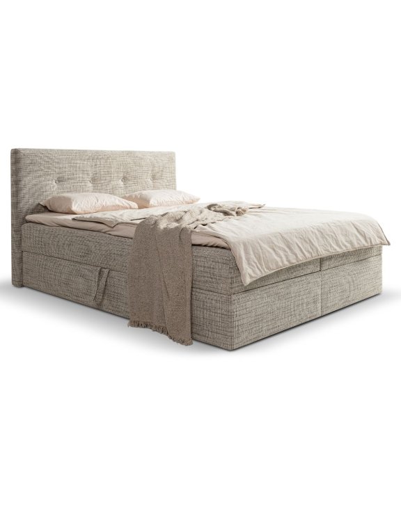 Łóżko kontynentalne składa się z kilku warstw – w tym przypadku zintegrowanej podstawy ze sprężynami, materaca właściwego oraz opcjonalnego toppera – dzięki czemu zapewnia wysoki poziom wygody i ergonomii.
