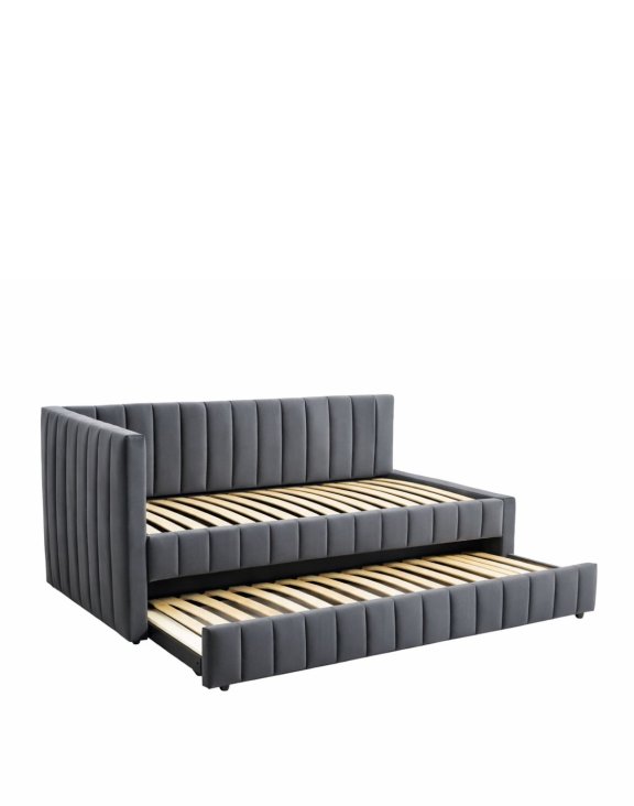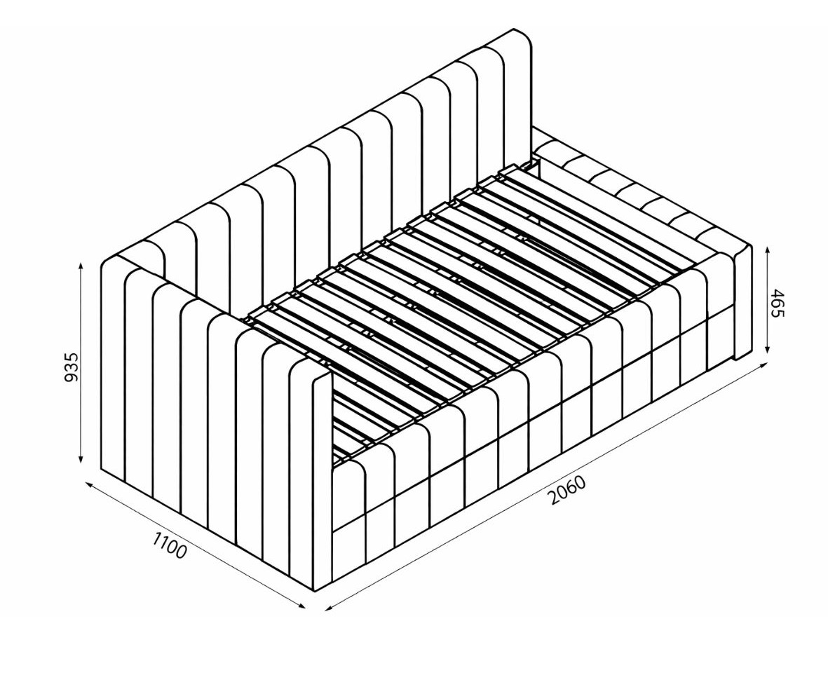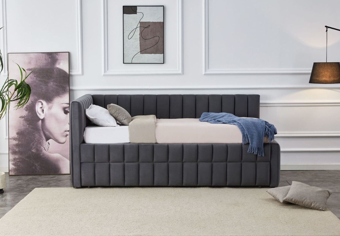 Łóżko zostało wykonane z solidnej konstrukcji tapicerowanej tkaniną, a stabilna rama i wykończone boki zapewniają bezpieczeństwo i komfort użytkowania.