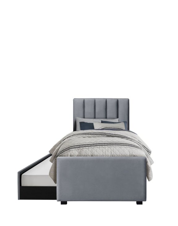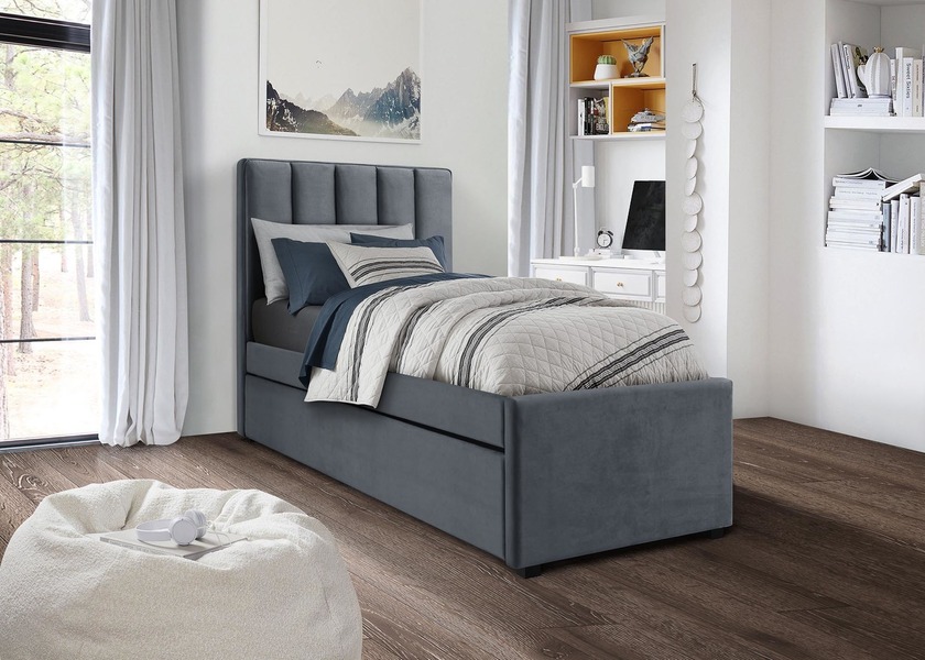 Łóżko Russo 90x200 to tapicerowane łóżko jednoosobowe z wysuwanym dolnym materacem, zaprojektowane z myślą o funkcjonalnym wykorzystaniu przestrzeni w pokoju młodzieżowym, sypialni lub pokoju gościnnym.