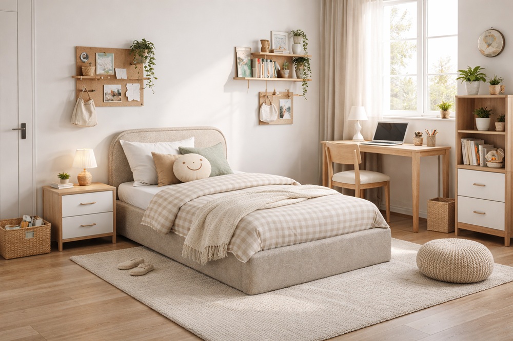 Santiago dostępne jest w dwóch kompaktowych rozmiarach – 90x200 cm oraz 120x200 cm, co czyni je idealnym wyborem do mniejszych pomieszczeń, gdzie liczy się każdy centymetr przestrzeni. Wbudowany pojemnik na pościel pozwala wygodnie przechowywać kołdry, poduszki lub tekstylia, pomagając utrzymać porządek w pokoju.