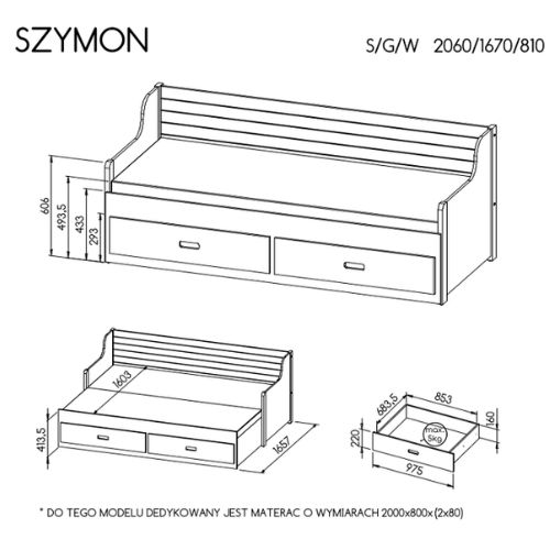 Łóżko sprzedawane jest bez materacy, jednak istnieje możliwość dokupienia materaca dedykowanego do tego modelu o grubości 8 cm, wykonanego z pianki - 200 x 160 (80x2) x 8 cm