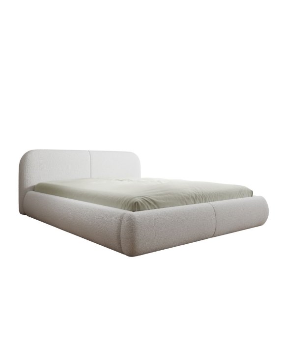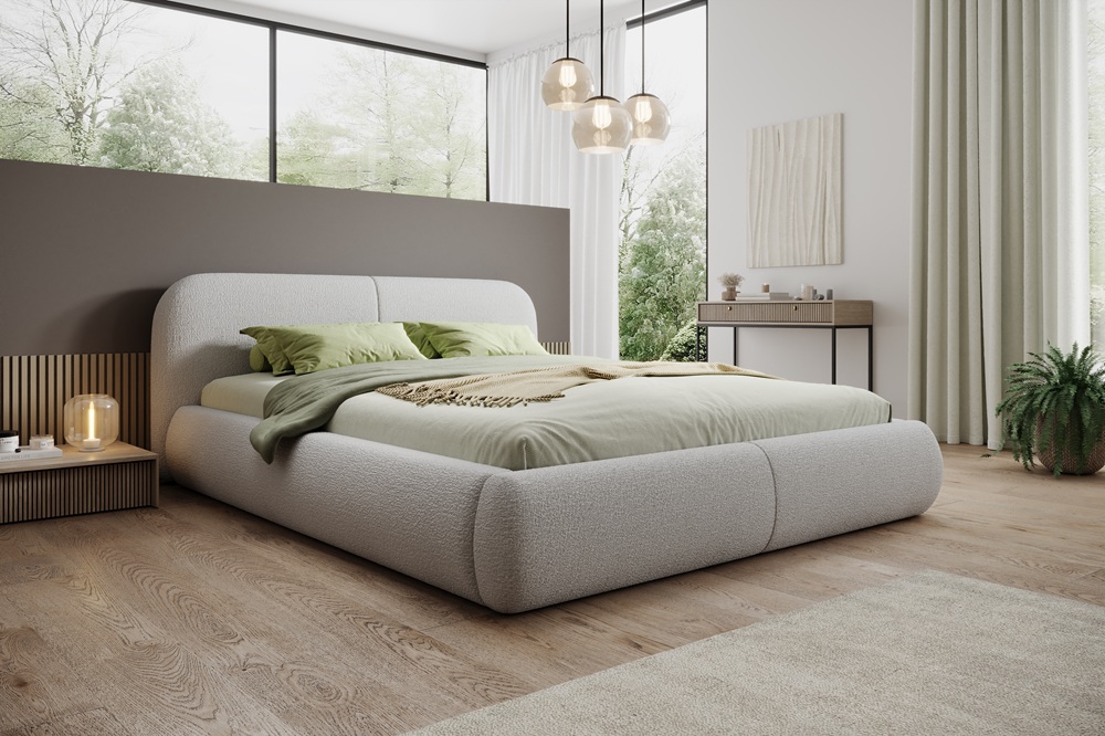 Łóżko Fogo doskonale prezentuje się w jasnych, miękkich tkaninach – szczególnie w strukturach typu boucle, które dodatkowo podkreślają jego obłą formę i nadają sypialni elegancki, nowoczesny wygląd.