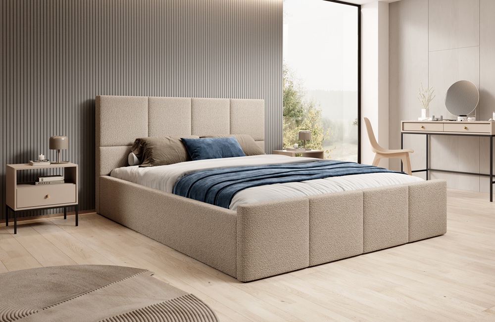 Model wyróżnia się bardzo cienkimi bokami oraz zagłówkiem o lekkiej, eleganckiej formie, dzięki czemu doskonale sprawdzi się zarówno w mniejszych sypialniach, jak i we wnętrzach urządzonych w stylu nowoczesnym, japandi lub soft loft.
