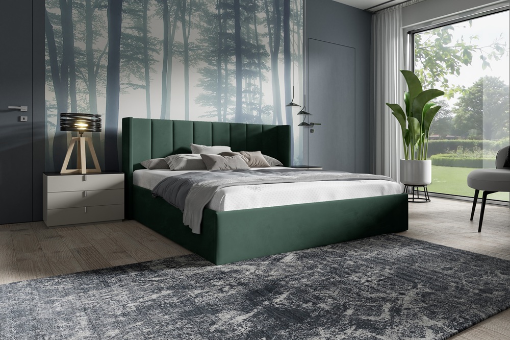 Charakterystyczne pionowe przeszycia wezgłowia nadają łóżku elegancki, ponadczasowy wygląd, który doskonale wpisuje się w aranżacje nowoczesne, hotelowe, minimalistyczne oraz glamour. Tapicerowana forma sprawia, że łóżko prezentuje się masywnie i stabilnie, a jednocześnie pozostaje wizualnie lekkie.
