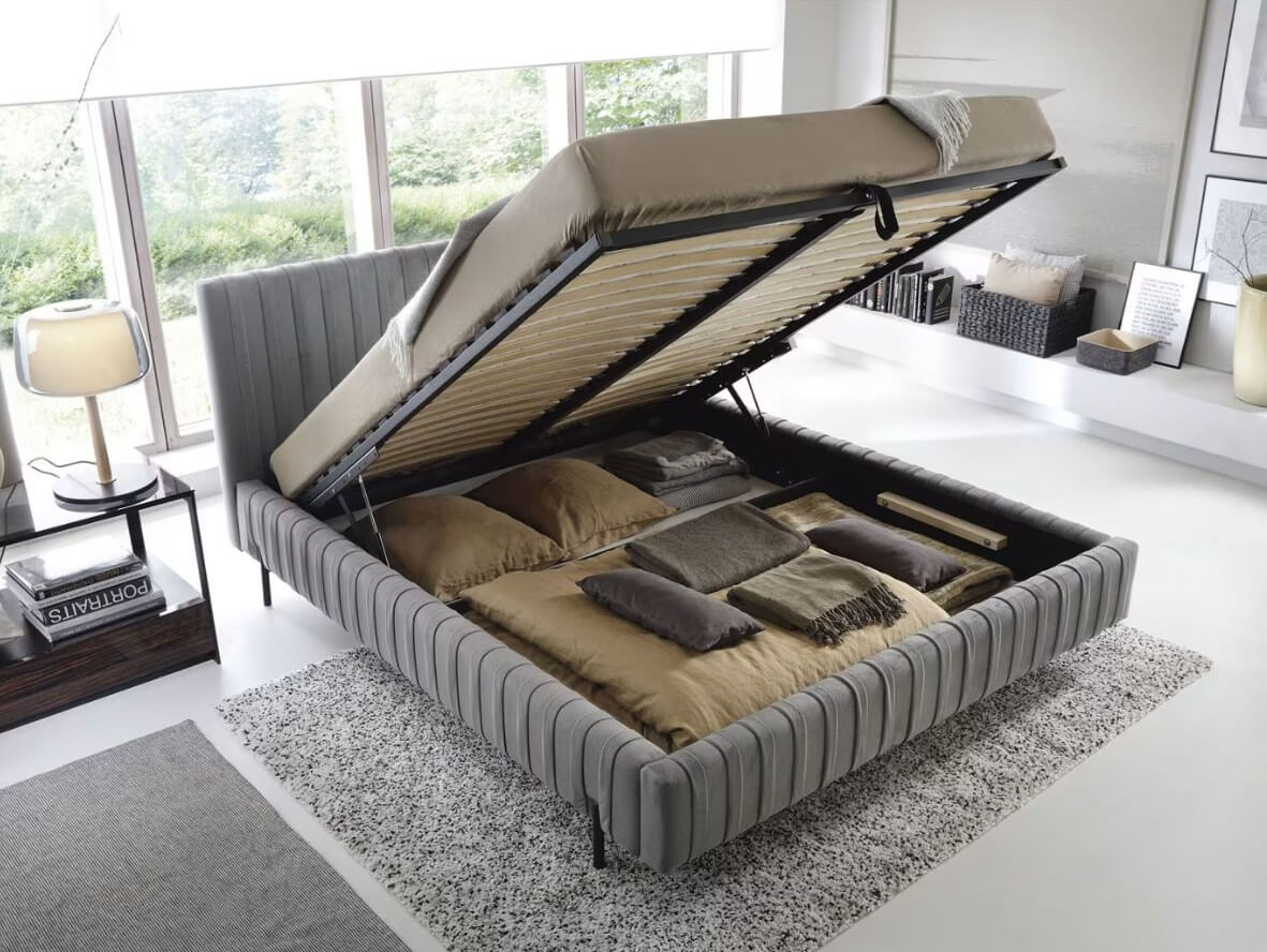 Model Plissa wyposażony jest w praktyczny pojemnik na pościel – idealne rozwiązanie do przechowywania kołder, poduszek i innych tekstyliów, co znacznie zwiększa funkcjonalność mebla.