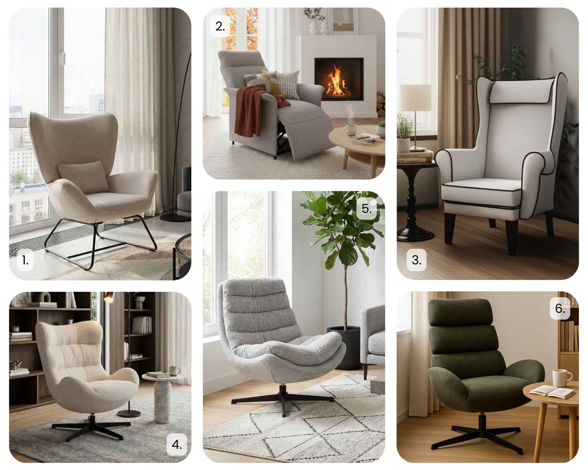 1. Fotel wypoczynkowy Nuvio jasnobeżowy | 2. Fotel Torro z funkcją elektrycznego rozkładania szary (CS2) | 3. Fotel Uszak z zagłówkiem i lamówką | 4. Fotel obrotowy Velo jasnobeżowy | 5. Nowoczesny fotel obrotowy Calvio szary | 6. Fotel obrotowy Cloud z wysokim oparciem zielony