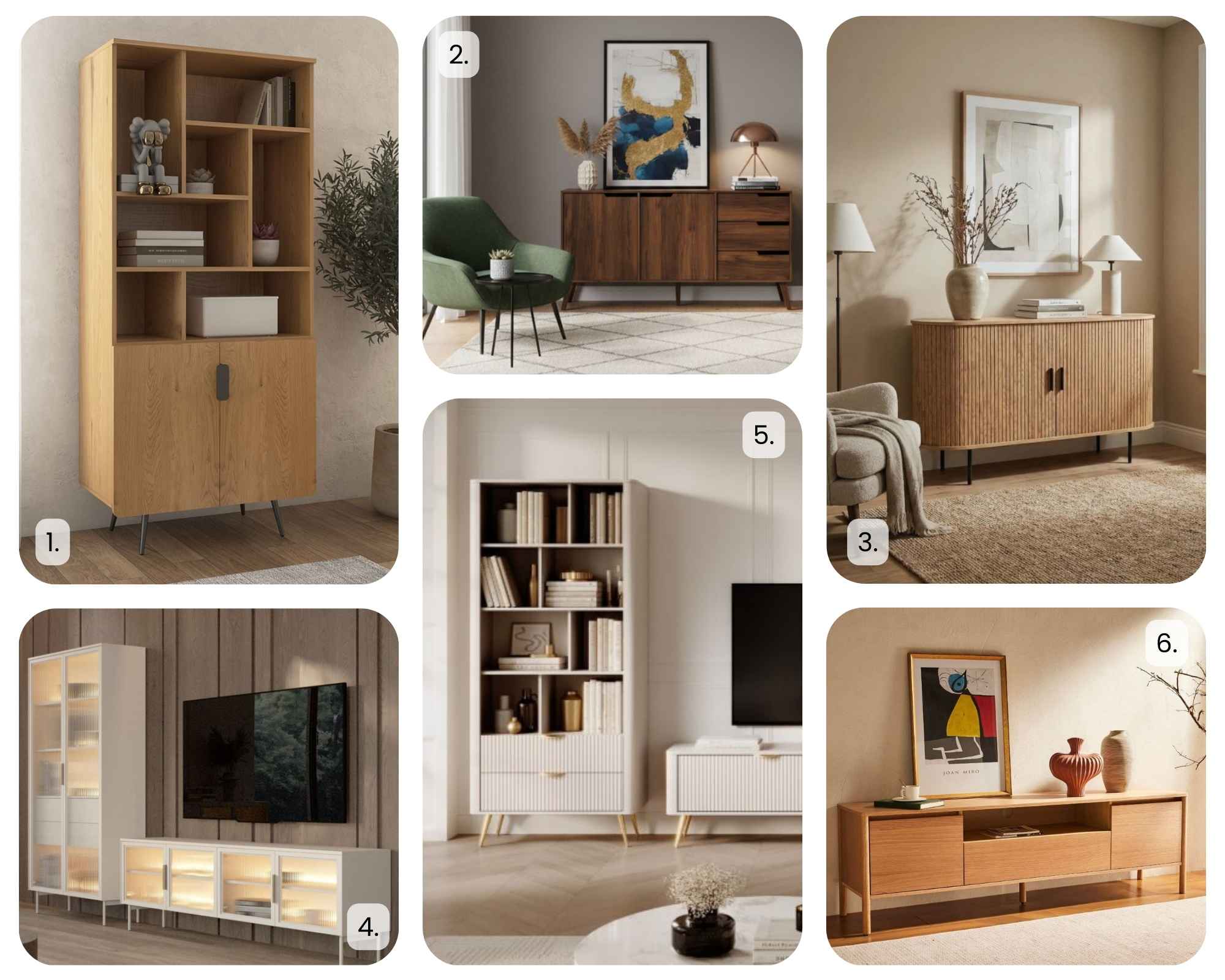 1. Regał na książki Radis (BS01) | 2. Komoda Nordelo Warmia Walnut 2D3S | 3. Szeroka komoda Loftwood (4802) | 4. Kaszmirowa witryna wysoka Lumi A z LED | 5. Wysoki ragał na książki z szufladami Lante A | 6. Szafka RTV Blair (TU01) 180 cm