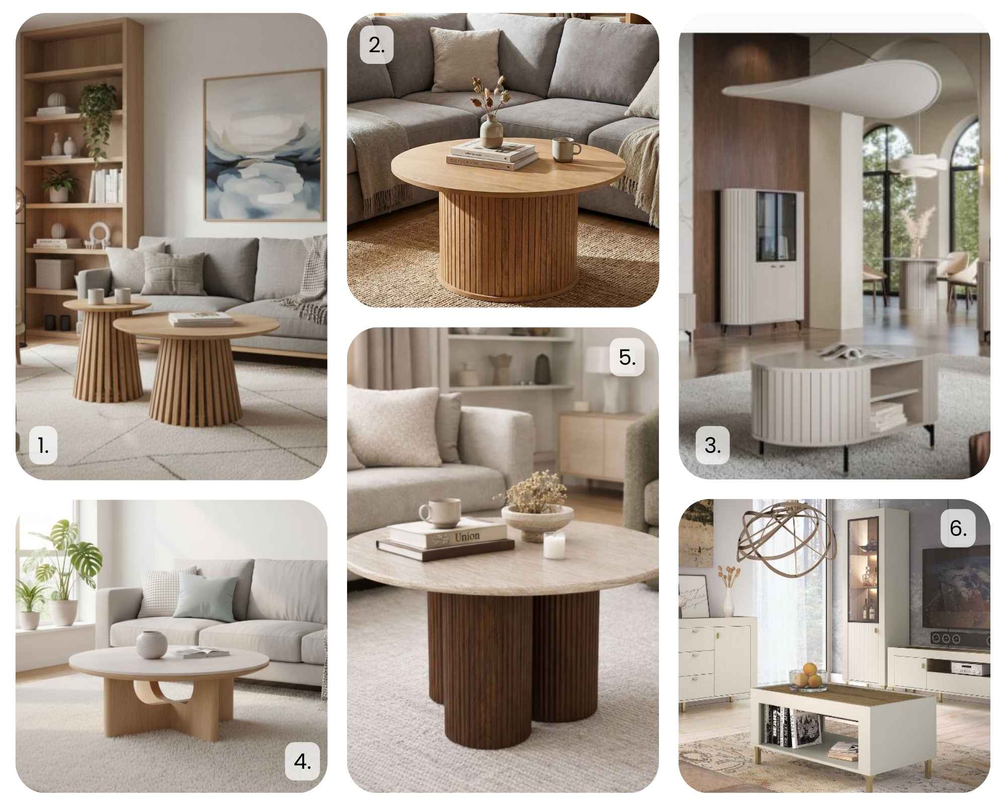 1. Zestaw stolików kawowych Arezzo | 2. Okągły stolik kawowy Loftwood-m (4807) | 3. Ława do salonu cashmere ZANTE ZA6 | 4. Okrągły stolik kawowy z blatem ceramicznym Calypso 80 cm | 5. Okrągły stolik kawowy Dorotea trawertyn 80x46 | 6. Kaszmir ława do salonu MOSSA MO9