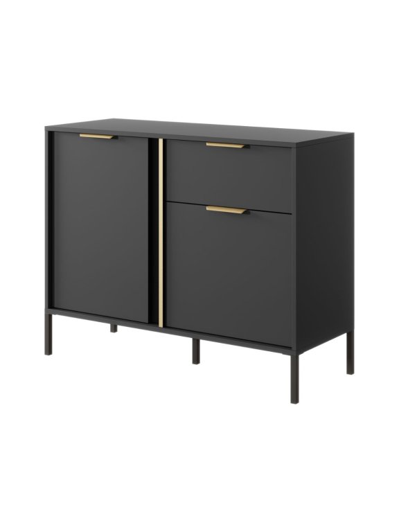 Komoda Lars A 2D2S to nowoczesny mebel w kolorze antracyt z eleganckimi złotymi uchwytami i smukłymi metalowymi nogami. Praktyczny układ z szufladami i półkami zapewnia wygodne przechowywanie i doskonale sprawdzi się w salonie lub jadalni.