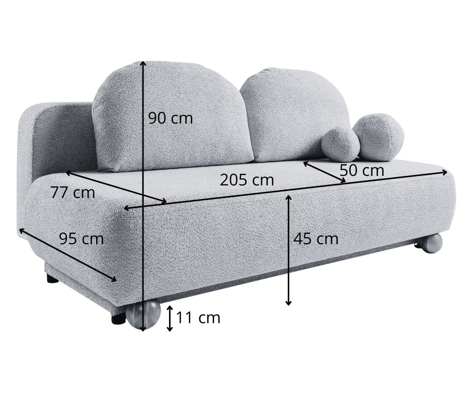 Wymiary: Szerokość 205 cm, głębokość całkowita 90 cm. Wysokość siedziska 45 cm, głębokość siedziska 50 cm (z poduszkami), wysokość nóżek 11 cm.