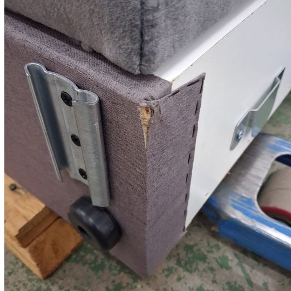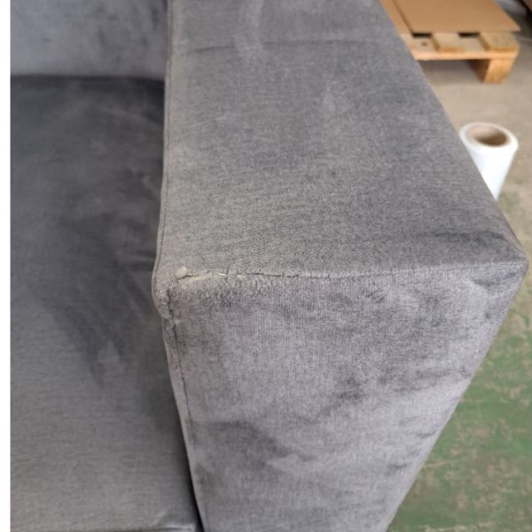 Narożnik posiada przetarcie na rogu skrzyni, na jednym podłokietniku zszyte rozcięcie. Zdjęcia uszkodzeń poniżej: