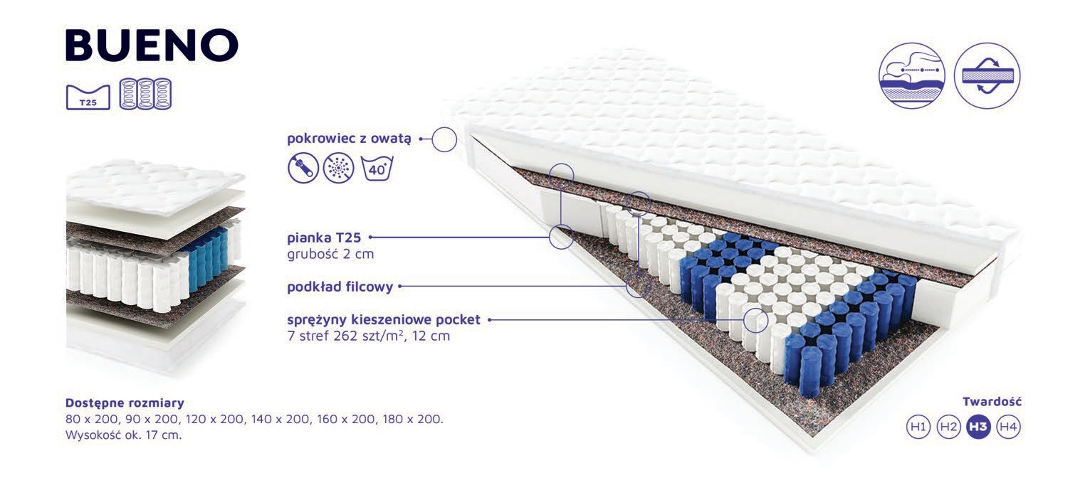 Model Bueno wyposażono w dwustronny pokrowiec LATO/ZIMA, który pomaga utrzymać odpowiednie warunki snu o każdej porze roku. Strona „lato” zapewnia lepszą przewiewność, natomiast strona „zima” daje delikatne uczucie otulenia. Pokrowiec jest antyalergiczny, zapinany na zamek i w pełni nadaje się do prania, co ułatwia utrzymanie higieny. -