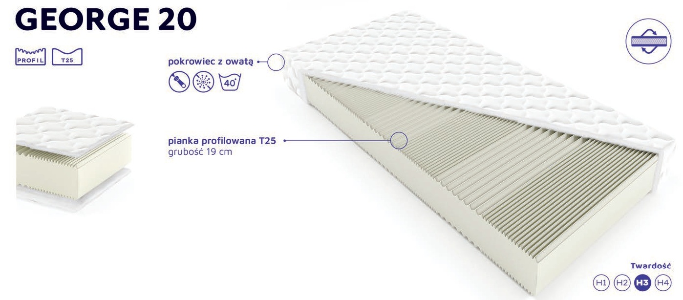 Materac George 20 to uniwersalny, średnio twardy model piankowy wykonany z elastycznej, profilowanej pianki poliuretanowej T25.