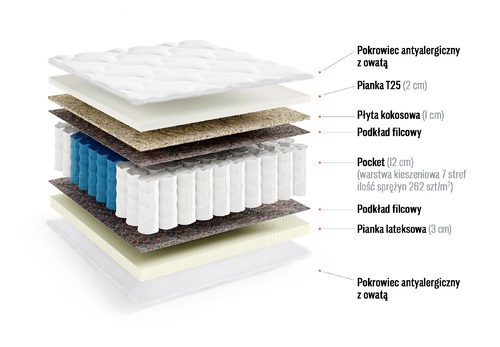 - pianka lateksowa (3 cm) – poprawia cyrkulację powietrza, ogranicza rozwój roztoczy i bakterii,