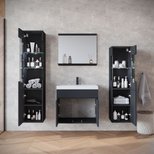 Zestaw mebli łazienkowych Nairobi czarny grafit. Zestaw składa się z dwóch wysokich słupków, pojemnej szafki pod umywalkę z umywalką o szerokości 60 cm oraz lustra z praktyczną półką. Model dedykowany jest do powieszenia na ścianie.