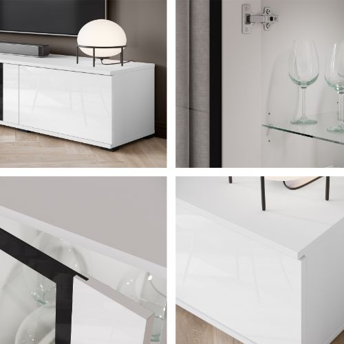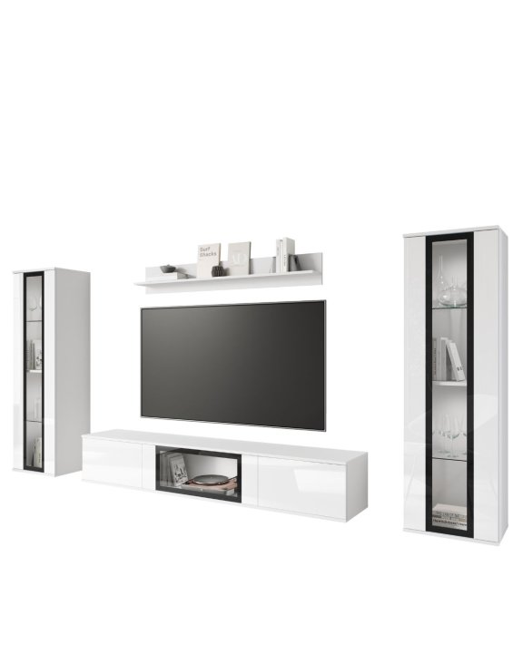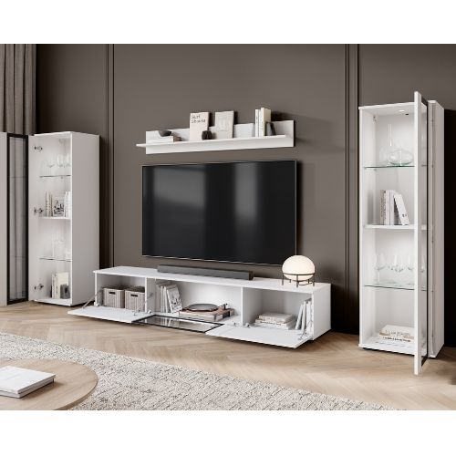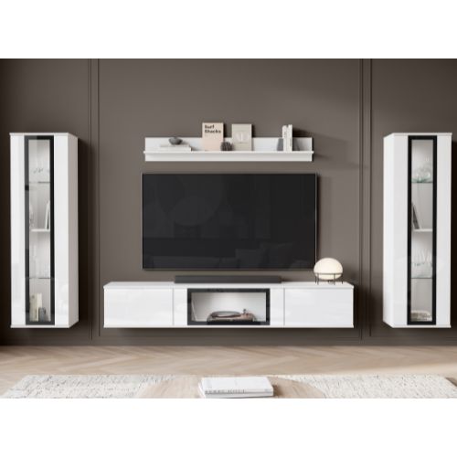 Meblościanka do salonu Caro z przeszkleniami w białym połysku z dwoma możliwościami montażu: wiszącym lub stojącym.