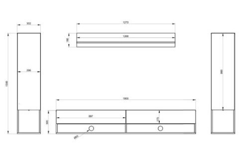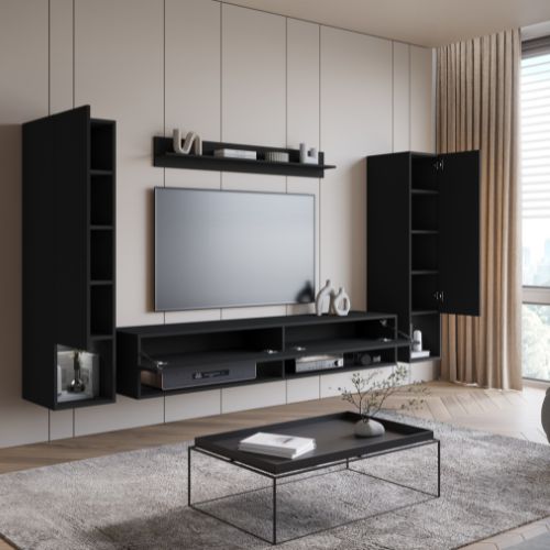 W skład zestawu wchodzi pojemna szafka RTV z miejscem na sprzęt multimedialny, dwie wysokie witryny boczne oraz elegancka półka ścienna. Przestrzeń została zaplanowana w sposób przemyślany – otwarte wnęki pozwalają na ekspozycję dekoracji, książek czy pamiątek, natomiast zamykane fronty zapewniają porządek i dyskrecję.