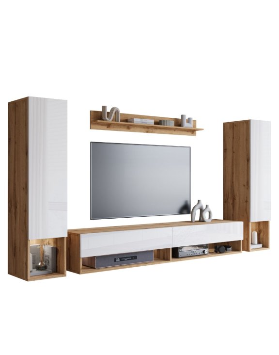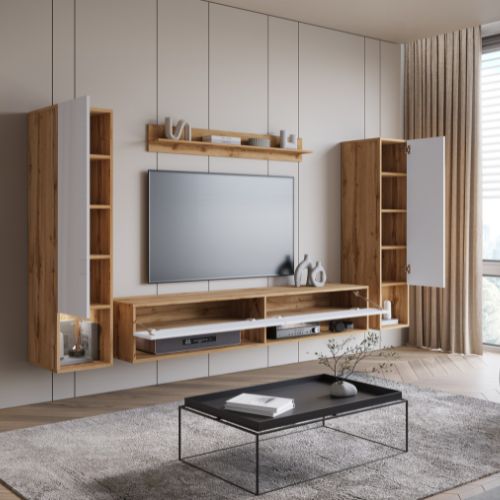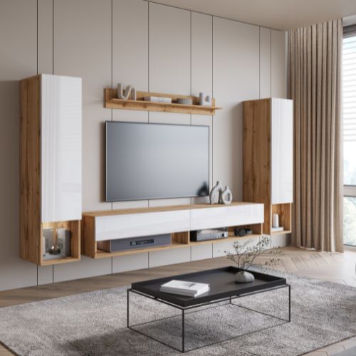 W skład zestawu wchodzi pojemna szafka RTV z miejscem na sprzęt multimedialny, dwie wysokie witryny boczne oraz elegancka półka ścienna. Przestrzeń została zaplanowana w sposób przemyślany – otwarte wnęki pozwalają na ekspozycję dekoracji, książek czy pamiątek, natomiast zamykane fronty zapewniają porządek i dyskrecję.