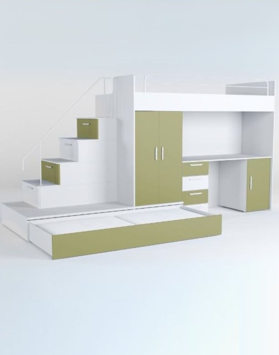 Łączy wygodne miejsce do spania, praktyczne biurko, pojemną szafę oraz bezpieczne schodki z funkcją przechowywania, dodatkowo posiada wygodne siedzisko oraz wysuwany materac.