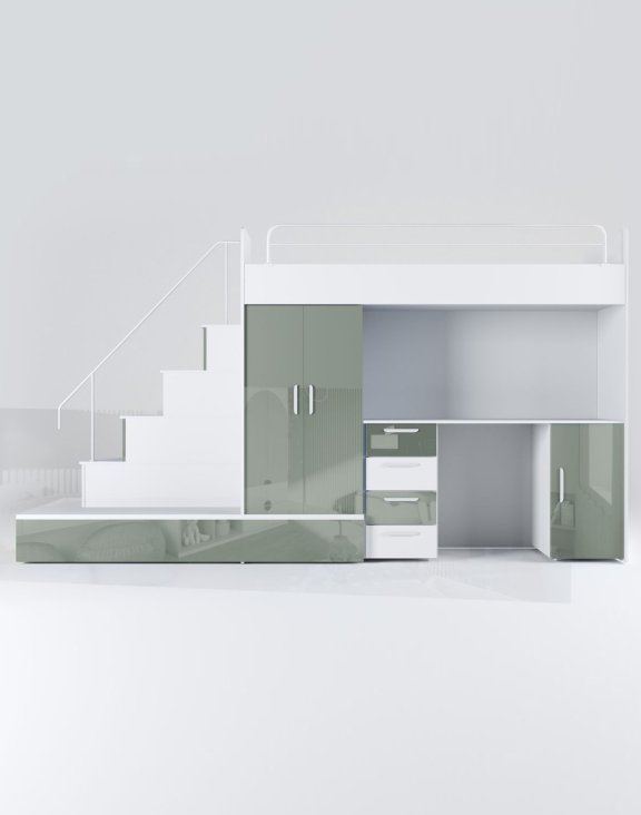 Łączy wygodne miejsce do spania, praktyczne biurko, pojemną szafę oraz bezpieczne schodki z funkcją przechowywania, dodatkowo posiada wygodne siedzisko oraz wysuwany materac.