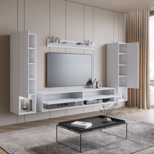 W skład zestawu wchodzi pojemna szafka RTV z miejscem na sprzęt multimedialny, dwie wysokie witryny boczne oraz elegancka półka ścienna. Przestrzeń została zaplanowana w sposób przemyślany – otwarte wnęki pozwalają na ekspozycję dekoracji, książek czy pamiątek, natomiast zamykane fronty zapewniają porządek i dyskrecję.