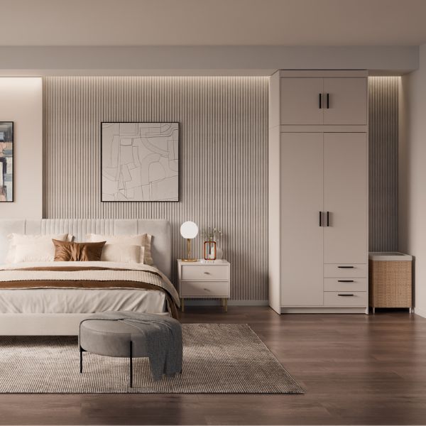 Dzięki prostej, nowoczesnej formie oraz kolorystyce beż piaskowy doskonale pasuje do współczesnych wnętrz – sypialni, garderoby czy przedpokoju.