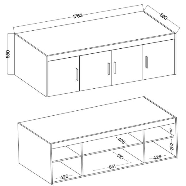 Model wyposażony jest w czworo drzwi, za którymi znajdują się przestronne komory do przechowywania rzadziej używanych rzeczy, takich jak pościel, koce, sezonowa odzież czy akcesoria domowe.