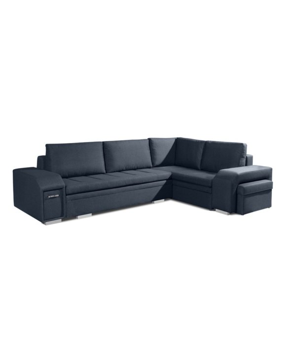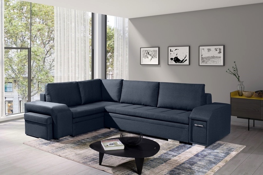 Model wyróżnia się ukrytą szufladą w podłokietniku, dodatkową wysuwaną pufą oraz dwoma pojemnikami na pościel, dzięki czemu doskonale sprawdzi się w salonach pełniących funkcję sypialni.