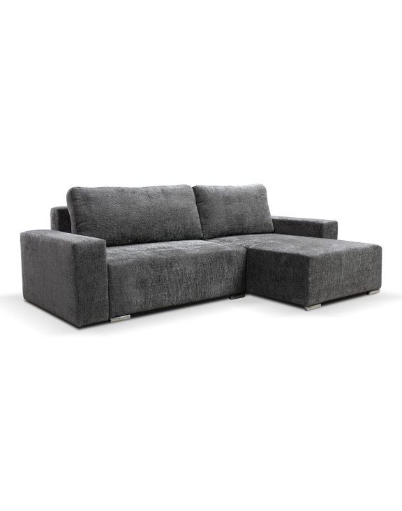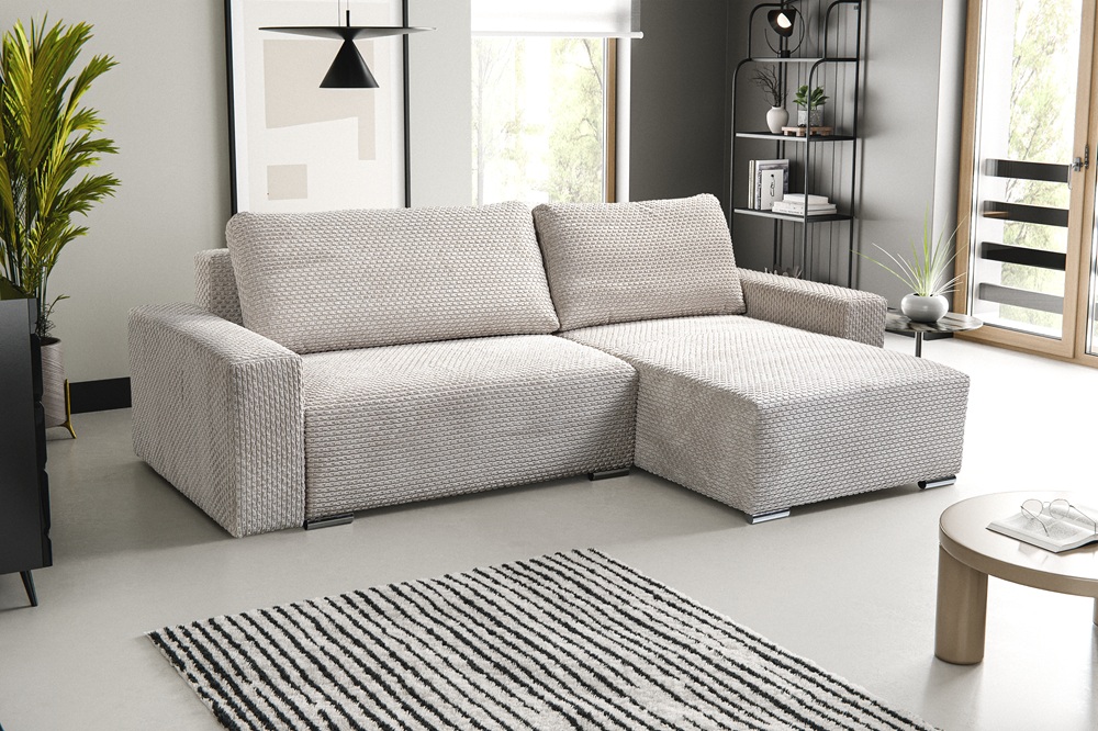 Model Anafi to narożnik uniwersalny – użytkownik sam decyduje w momencie montażu, czy ma być lewostronny, czy prawostronny. Tapicerowany tył pozwala ustawić go zarówno przy ścianie, jak i na środku pomieszczenia, co daje pełną swobodę aranżacyjną.