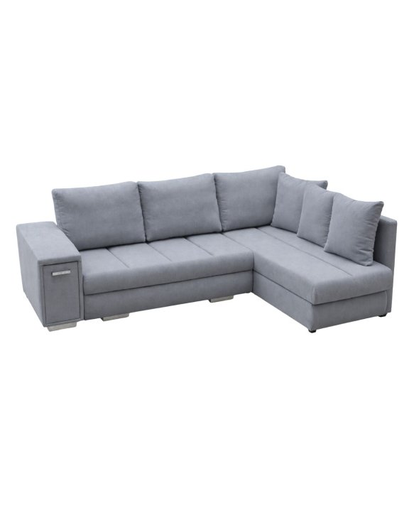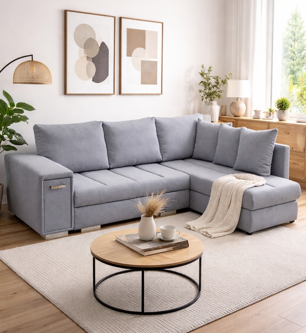 Narożnik Arni polskiej marki Kinas to nowoczesna i funkcjonalna propozycja do salonu, w którym liczy się komfort codziennego użytkowania oraz praktyczne rozwiązania. Model wyróżnia się zintegrowanym barkiem w podłokietniku oraz dwoma pojemnikami na pościel, co czyni go idealnym wyborem zarówno do relaksu, jak i do spania na co dzień.