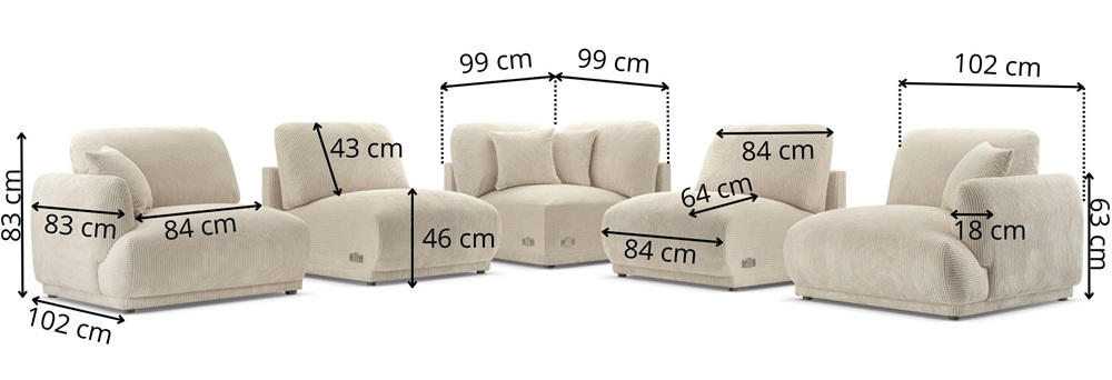 - moduł z podłokietnikiem: 102 × 102 cm