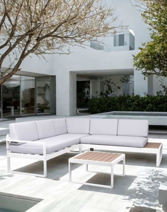 Narożnik ogrodowy Loreto White marki Avida Design to stylowy, nowoczesny zestaw wypoczynkowy na taras lub do ogrodu, który łączy wysoką jakość wykonania z komfortem użytkowania i odpornością na warunki atmosferyczne.