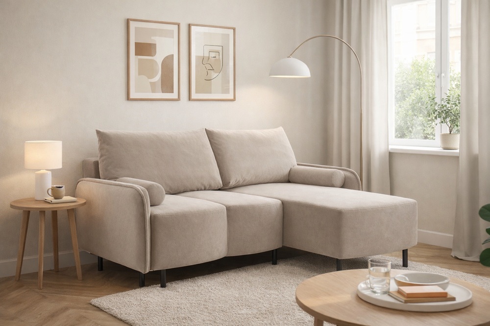 Narożnik Tini polskiej marki Kinas to idealne rozwiązanie do mniejszych salonów i nowoczesnych wnętrz. Lekko zaokrąglone kształty, miękkie poduszki oparciowe i smukłe metalowe nóżki nadają meblowi wyjątkowo elegancki, a zarazem przytulny charakter.