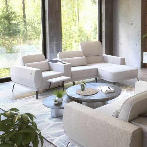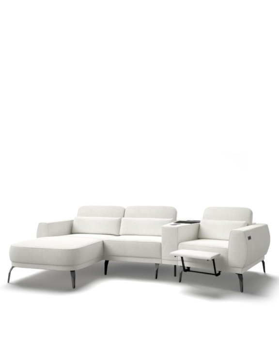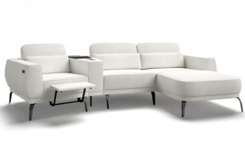 Dopełnieniem całości jest nowoczesny podnóżek, wbudowany w jeden z modułów, który pozwala wygodnie rozprostować nogi i cieszyć się chwilą relaksu, bez konieczności rozkładania całego mebla.