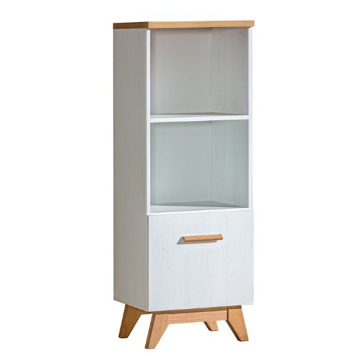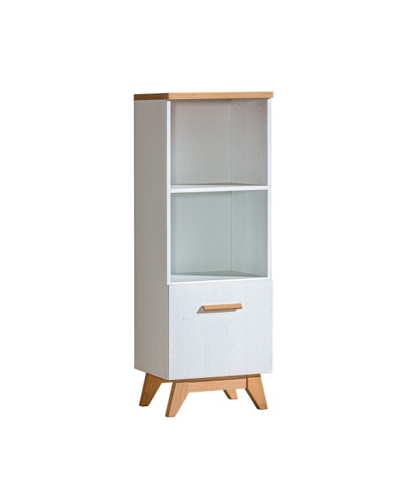 Niski regał słupek Sven, który idealnie sprawdzi się w salonie, pokoju dziennym, sypialni, jak i biurze. Model utrzymany w kolorystyce sosna andersen, który został przełamany wyrazistymi akcentami w odcieniu dąb nash, które dodają całości charakteru i ciepła.