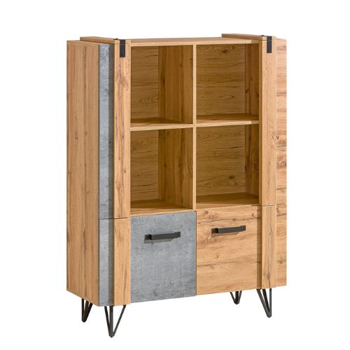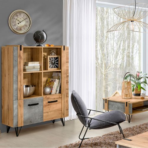 Niska komoda witryna Lofter LO4, jej design inspirowany jest modnym stylem industrialnym – połączenie ciepłego dekoru dębu z surowym odcieniem betonu tworzy intrygujący kontrast, który przyciąga wzrok i doskonale podkreśla charakter współczesnych wnętrz.