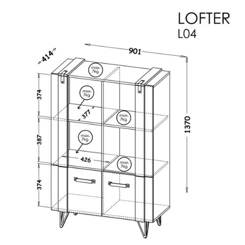 Czarne metalowe uchwyty i nogi nadają komodzie lekkości i podkreślają jej loftowy charakter, a solidna konstrukcja gwarantuje stabilność i trwałość przez lata.